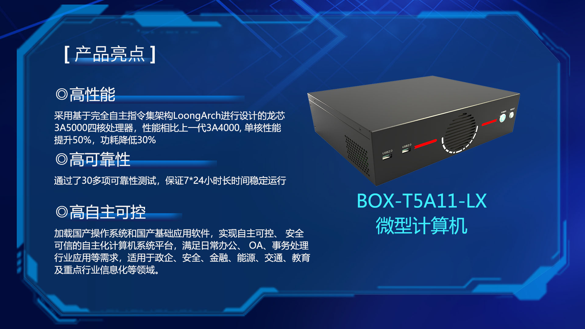 研恒(特控)BOX-T5A11-LX微型計(jì)算機(jī)采用基于完全自主指令集架構(gòu)LoongArch進(jìn)行設(shè)計(jì)的龍芯3A5000四核處理器,性能相比上一代3A4000, 單核性能提升50%,功耗降低30%,指令集系統(tǒng)架構(gòu)承載的軟件生態(tài)走向完全自主。整機(jī)采用純工業(yè)設(shè)計(jì),通過(guò)了30多項(xiàng)可靠性測(cè)試,保證設(shè)備7*24小時(shí)長(zhǎng)時(shí)間穩(wěn)定運(yùn)行。配套國(guó)產(chǎn)BIOS,加載國(guó)產(chǎn)操作系統(tǒng)和國(guó)產(chǎn)基礎(chǔ)應(yīng)用軟件,實(shí)現(xiàn)自主可控、 安全可信的自主化計(jì)算機(jī)系統(tǒng)平臺(tái),滿足日常辦公、 OA、事務(wù)處理,行業(yè)應(yīng)用等需求,適用于政企、安全、金融、能源、交通、教育及重點(diǎn)行業(yè)信息化等領(lǐng)域。