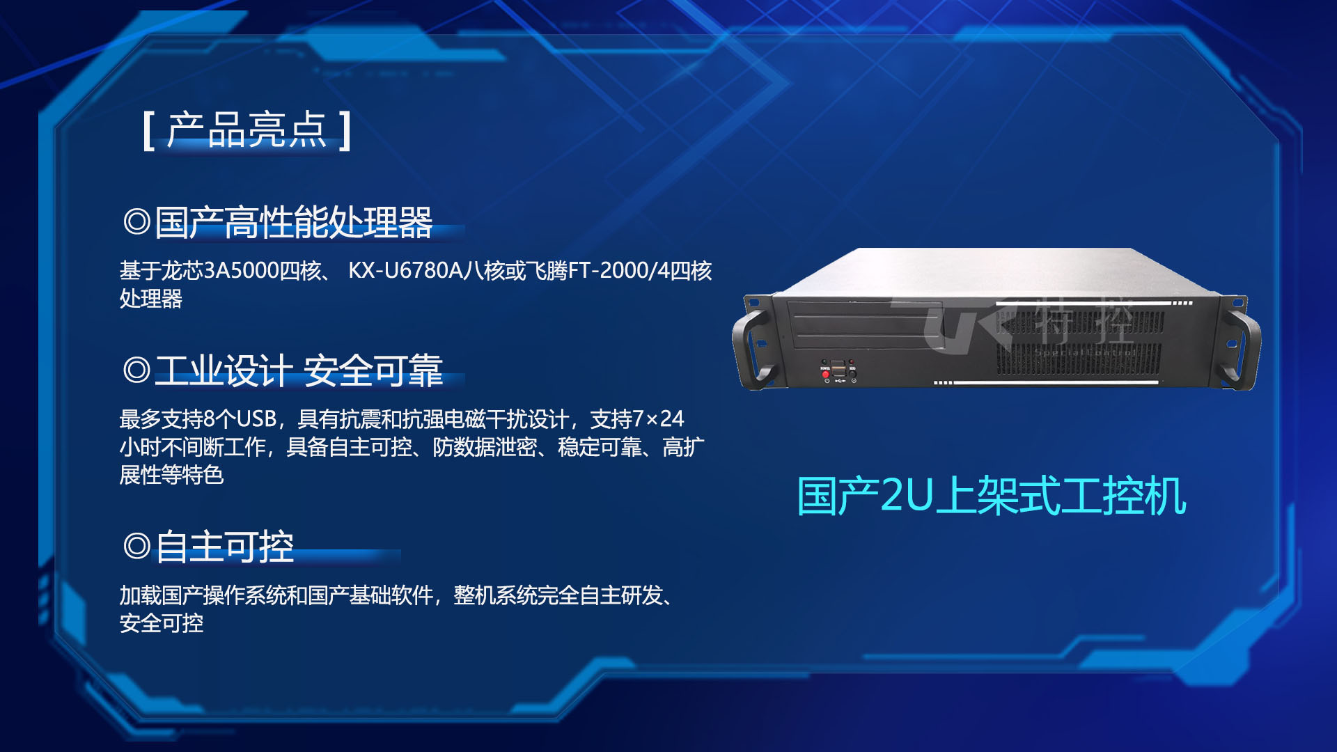 研恒(特控)國(guó)產(chǎn)2U上架式工控機(jī)基于龍芯3A5000四核、 KX-U6780A八核或飛騰FT2000/4四核處理器,配套國(guó)產(chǎn)BIOS, 加載國(guó)產(chǎn)操作系統(tǒng)和國(guó)產(chǎn)基礎(chǔ)軟件,整機(jī)系統(tǒng)完全自主研發(fā)、安全可控。最多支持8個(gè)USB,具有抗震和抗強(qiáng)電磁干擾設(shè)計(jì),支持7×24小時(shí)不間斷工作,具備自主可控、防數(shù)據(jù)泄密、穩(wěn)定可靠、高擴(kuò)展性等特色。