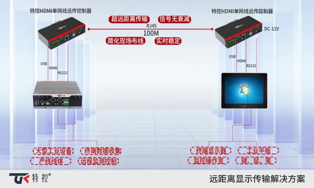 工業設備的迅速發展,隨著尺寸變大,主機與顯示器的距離隨之變長。設備功率也越來越大,隨之帶來的電磁干擾也是越來越強。在這種長距離強干擾的應用環境,加上HDMI/DVI/VGA自身信號傳輸的能力有限,就算使用高規格線材也無法適用這樣的應用環境。特控深研客戶現場需求,以解決客戶實際問題為目的,推出遠距離傳輸控制解決方案。