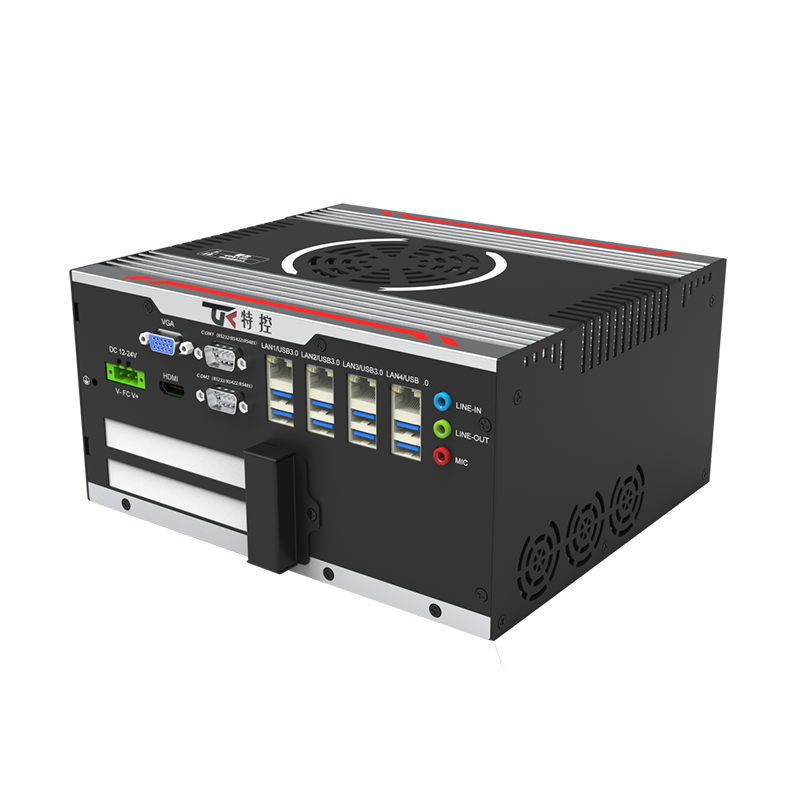 與豎向等多種放置的自然對流散熱,機箱可抗接觸式6KV強電磁干擾,DC12V-24V寬壓輸入接口豐富:4*LAN(Intel),6*COM,24*GPIO(12*GPI,12*GPO,帶隔離),7*USB3.0+1*USB2.0,1*VGA,
